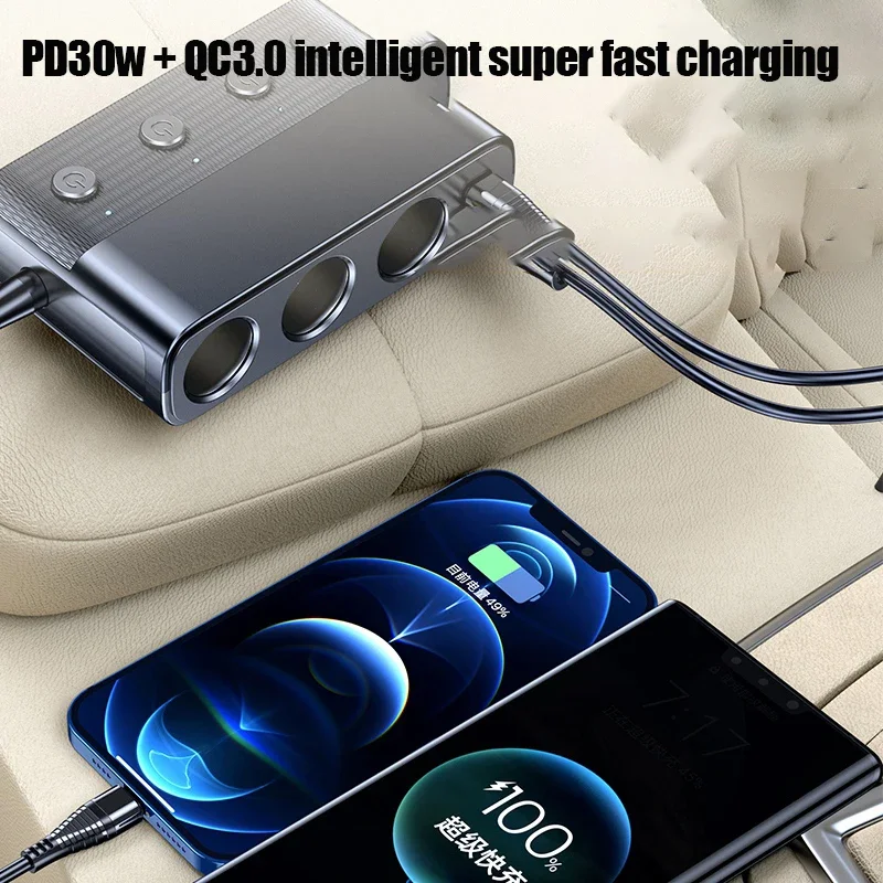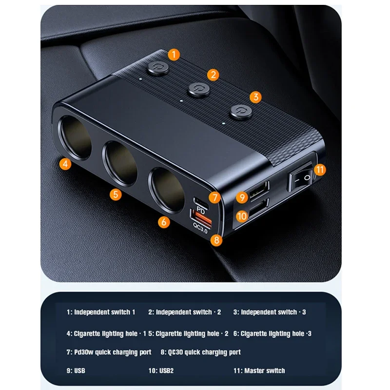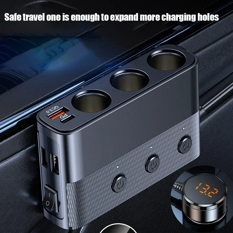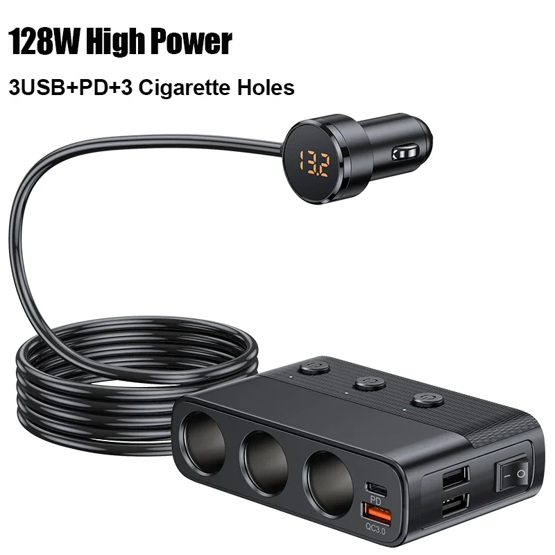 Power up all your devices on the go with the 128W Multi-Port Car Charger Splitter. Designed with PD30W and QC3.0 fast-charging ports, this adapter ensures your phones, tablets, dash cams, and GPS units charge quickly and safely. Featuring multiple cigarette lighter sockets and USB ports, it allows you to power several devices simultaneously without overloading your vehicle’s circuit. The built-in independent switch lets you easily control each port for energy efficiency and convenience. Crafted with durable materials and intelligent protection systems, it prevents overheating, overcharging, and short circuits. Perfect for long road trips, daily commutes, and family vehicles, this is the ultimate power hub for modern drivers.