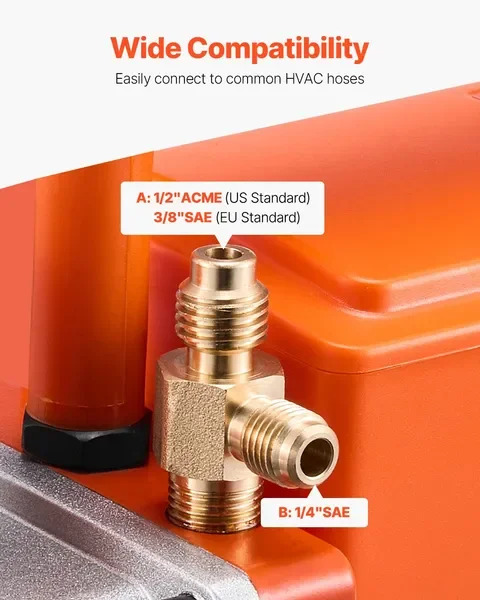 The 3.5 CFM Single Stage Vacuum Pump is a powerful and reliable tool designed for HVAC and refrigeration servicing. Featuring a rotary vane design, it delivers efficient air evacuation and deep vacuum performance for quick and precise results. This pump is ideal for air conditioning, refrigeration repair, and automotive maintenance tasks. It comes pre-filled with high-grade vacuum pump oil, ensuring smooth operation and long-lasting performance. The heavy-duty aluminum alloy casing provides excellent durability and heat dissipation, while the easy-to-read sight glass and oil drain plug make maintenance simple. Whether for professional technicians or DIY enthusiasts, this pump offers strong suction power, low noise, and stable operation, making it a must-have for any HVAC toolkit.