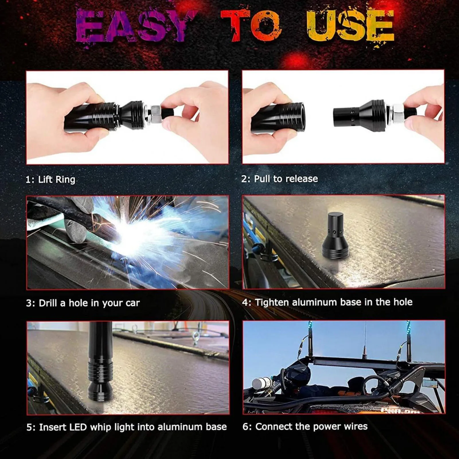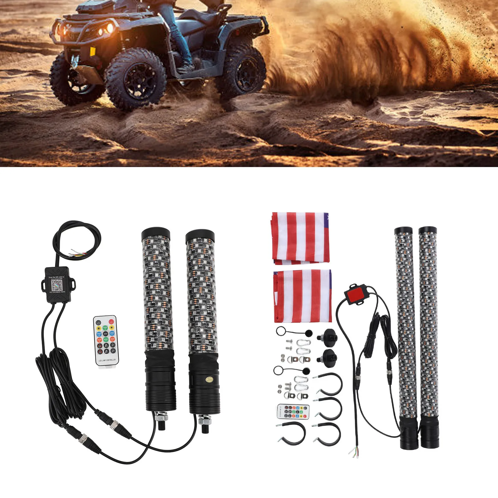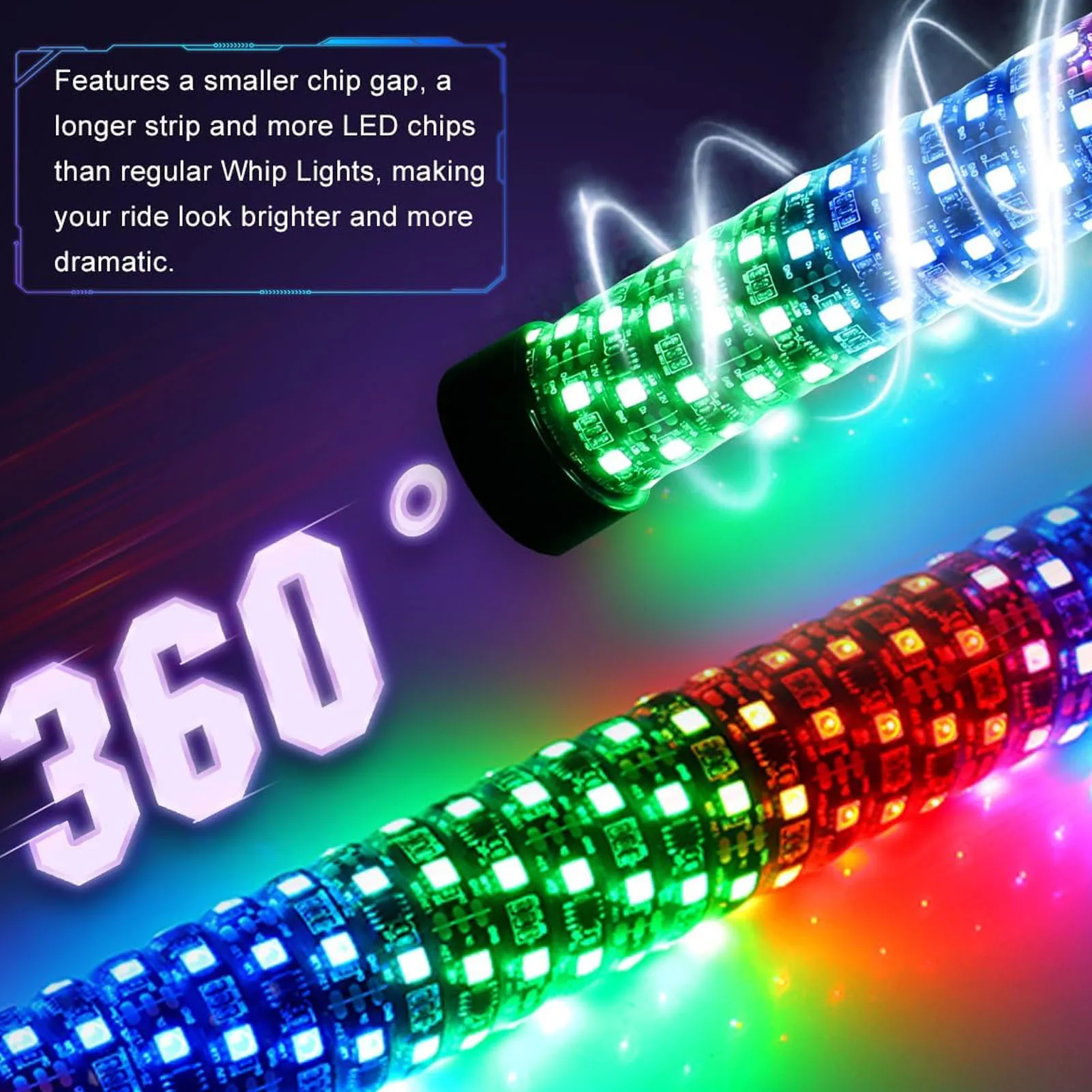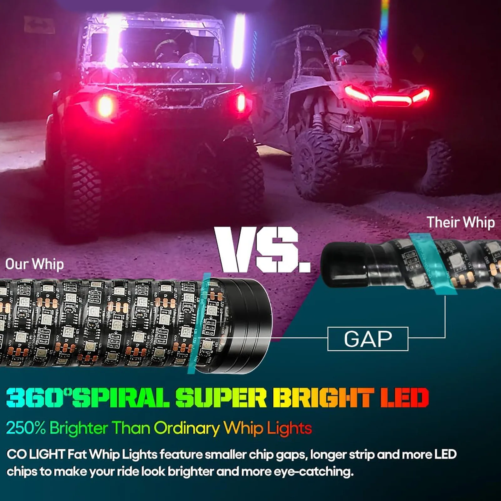 Enhance your off-road adventures with these Spiral RGB LED Whip Lights, designed for RZR, UTV, and ATV vehicles. Featuring 10 adjustable speed settings and 300 customizable patterns, these whip lights deliver dynamic, eye-catching illumination for day or night rides. The sound-activated function allows the lights to sync with music or engine noise, creating a thrilling visual effect. Built from durable, weather-resistant materials, they are ideal for rugged off-road conditions. Easy to mount and operate, these lights add both style and safety, making your vehicle more visible in low-light environments. Perfect for trail riding, dune adventures, or showcasing your ride at events, these whip lights combine functionality, durability, and high-impact visual appeal.